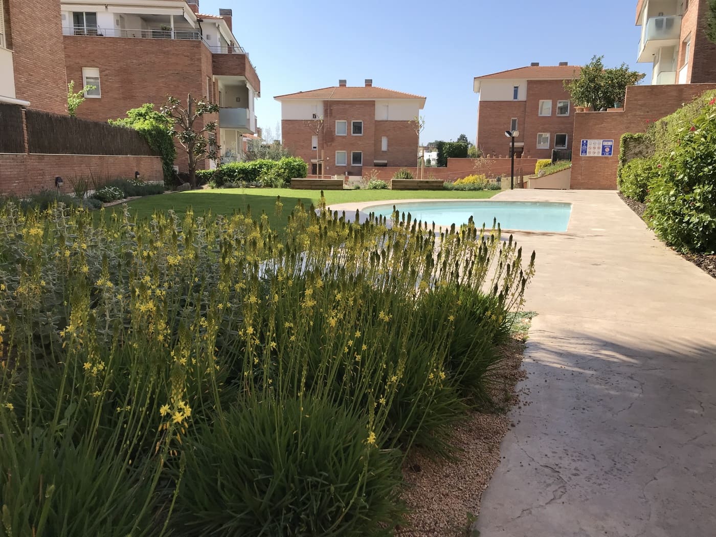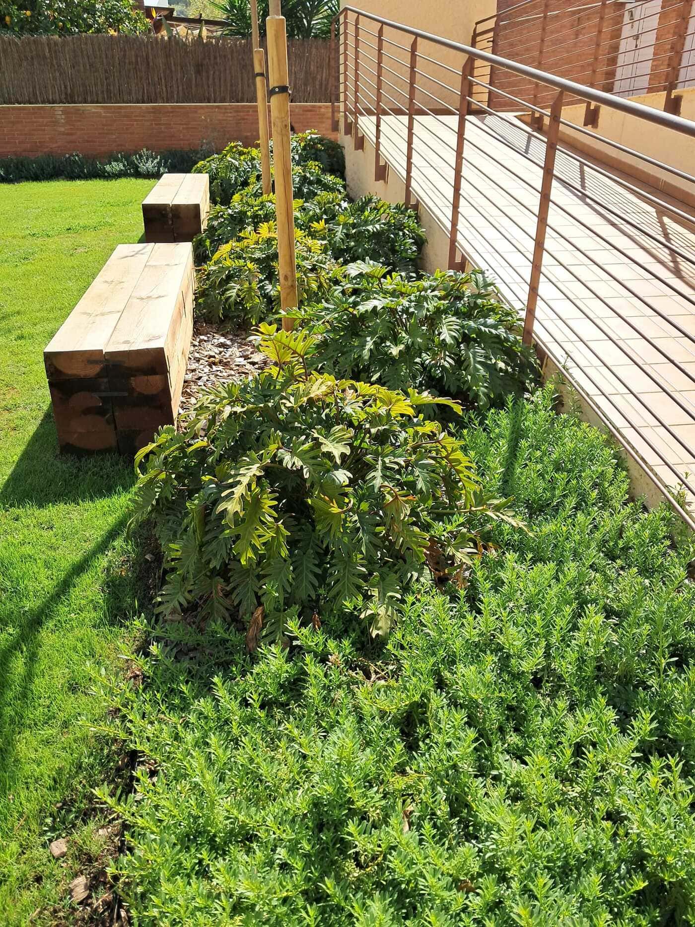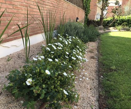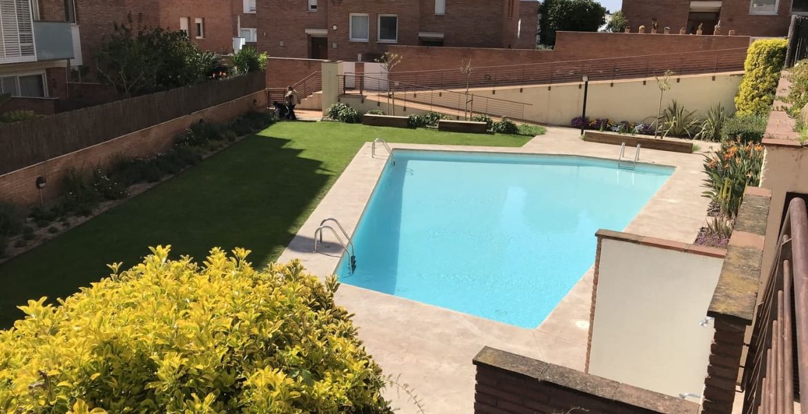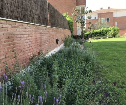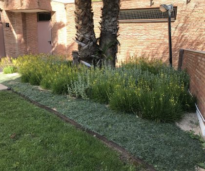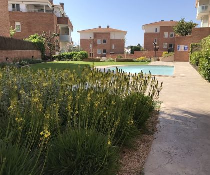 Enjardinament d’un jardí comunitari per tal de reduir la superfície de gespa a la zona de les piscines i crear punts d’interès i estada. Es fa una plantació diversa en tot l’entorn de la piscina.